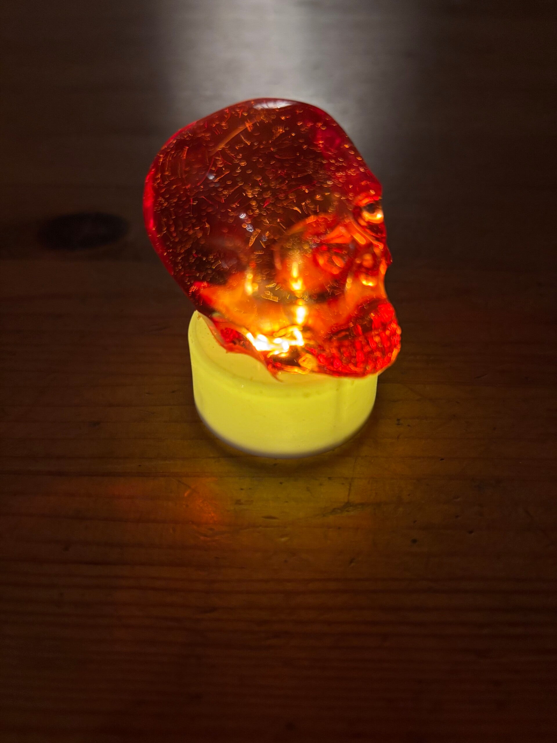 Dieser kleine Kerl leuchtet im Dunkeln. Er ist transparent rot mit LED flackernd.