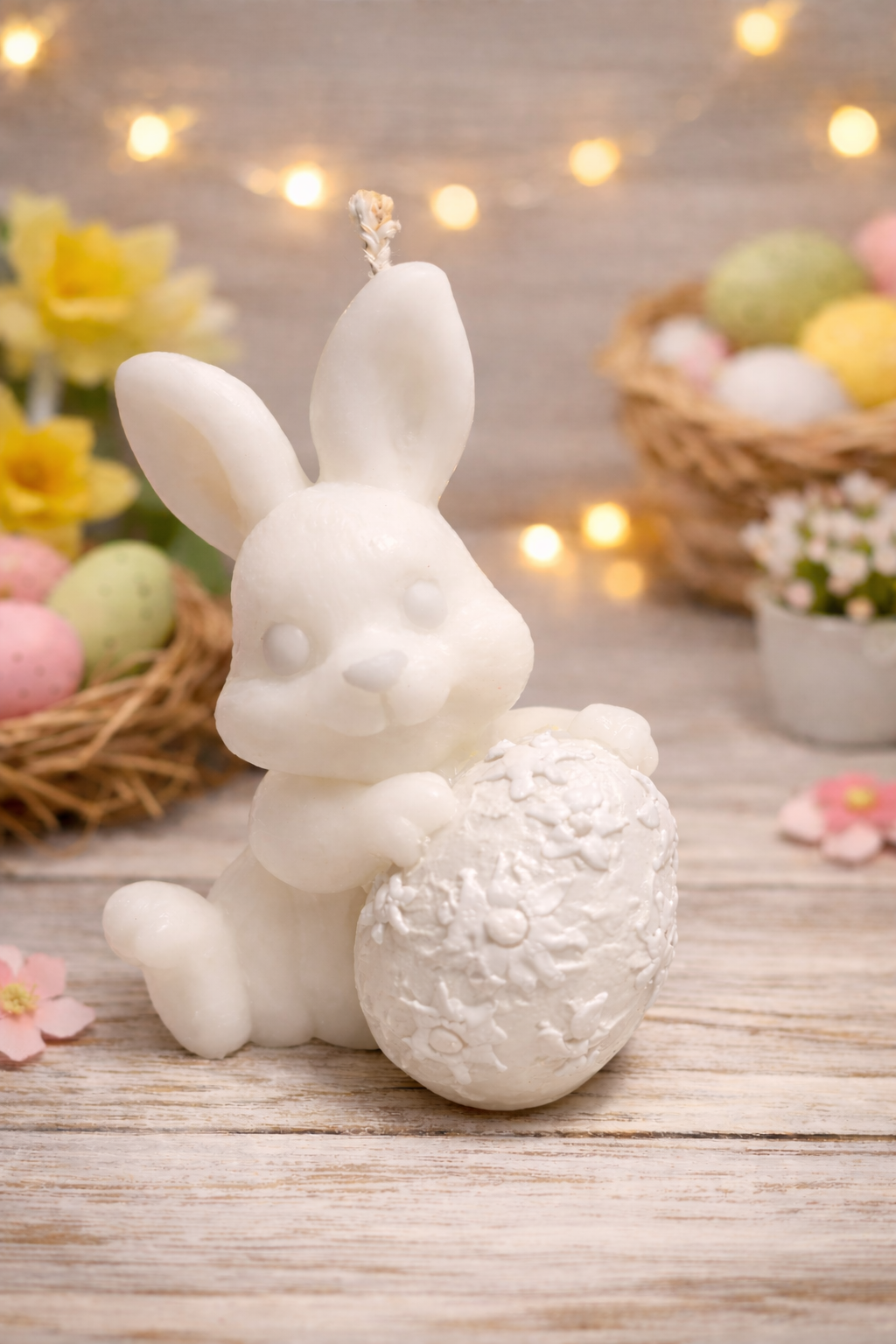 Diese liebevoll gestaltete Hasenkerze bringt frühlingshafte Wärme und Osterstimmung in jedes Zuhause. Der niedliche Hase mit zarten rosa Ohrdetails hält ein dekoratives Ei mit roten Blütenmustern – ein echter Blickfang für Tisch, Fensterbank oder Osternest.